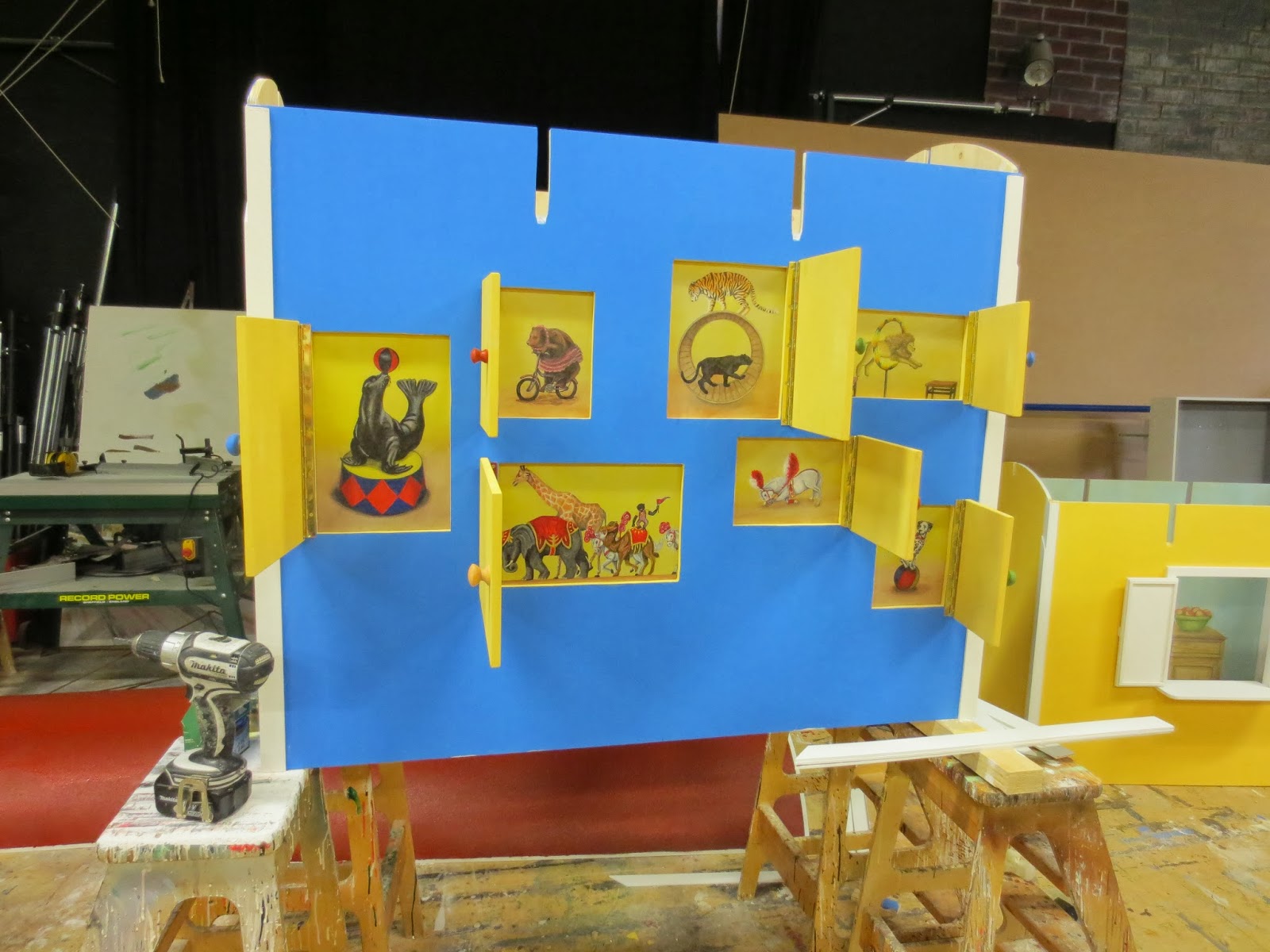 | Eläinvaunun seinä luukuilla, joita avamalla lapset näkevät hienot eläinkuvat. |